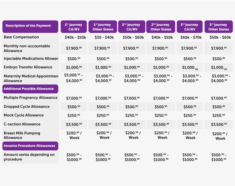 Once you have been qualified and have completed the Omega Surrogate Process, and you decide to begin this incredible adventure with us (yay!), there are different compensation packages for Surrogates. Depending on which journey you are starting, whether it is your first, second, or third journey, the amount that you will receive will vary. There are different types of allowances that may be included in your contract, but it all comes down to the agreement you achieve with your Intended Parents during the legal process.